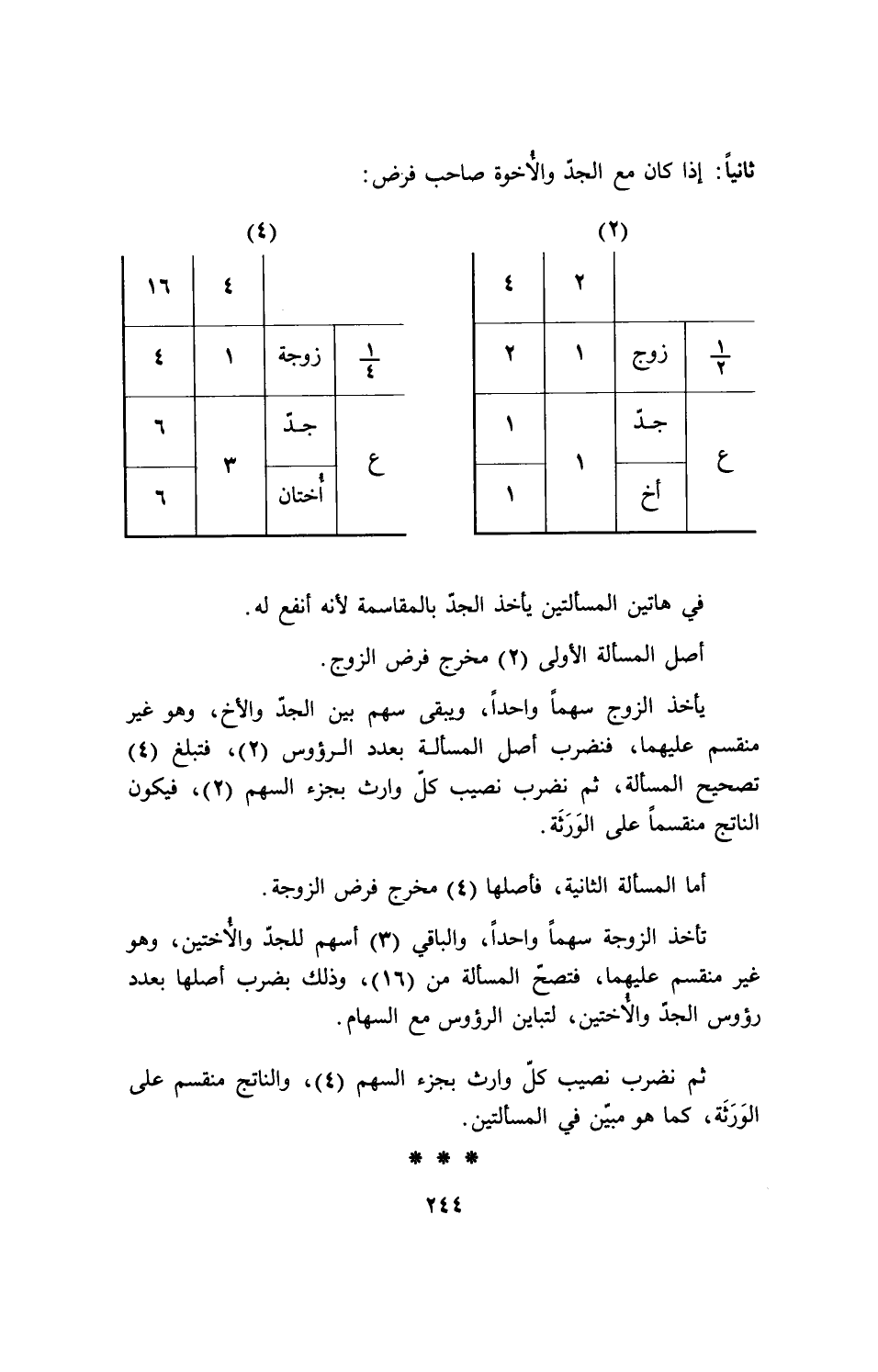 ثم نضرب نصيب كل وارث بجزء السهم (4)، والناتج منقسم على الورثة، كما هو مبين في المسألتين.