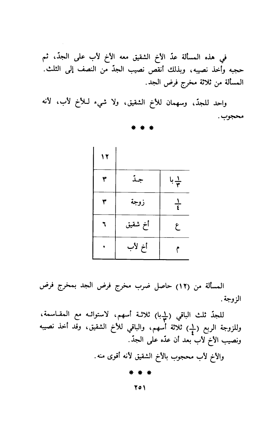 في هذه المسألة عدّ الأخ الشقيق معه الأخ لأب على الجد، ثم حجبه وأخذ نصيبه، وبذلك أنقص نصيب الجد من النصف إلى الثلث. المسألة من ثلاثة مخرج فرض الجد.