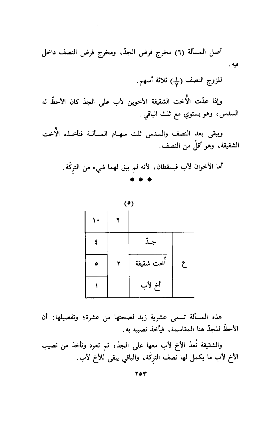 والشقيقة تعد الأخ لأب معها على الجد، ثم تعود وتأخذ من نصيب الأخ لأب ما يكمل لها نصف التركة، والباقي يبقى للأخ لأب.