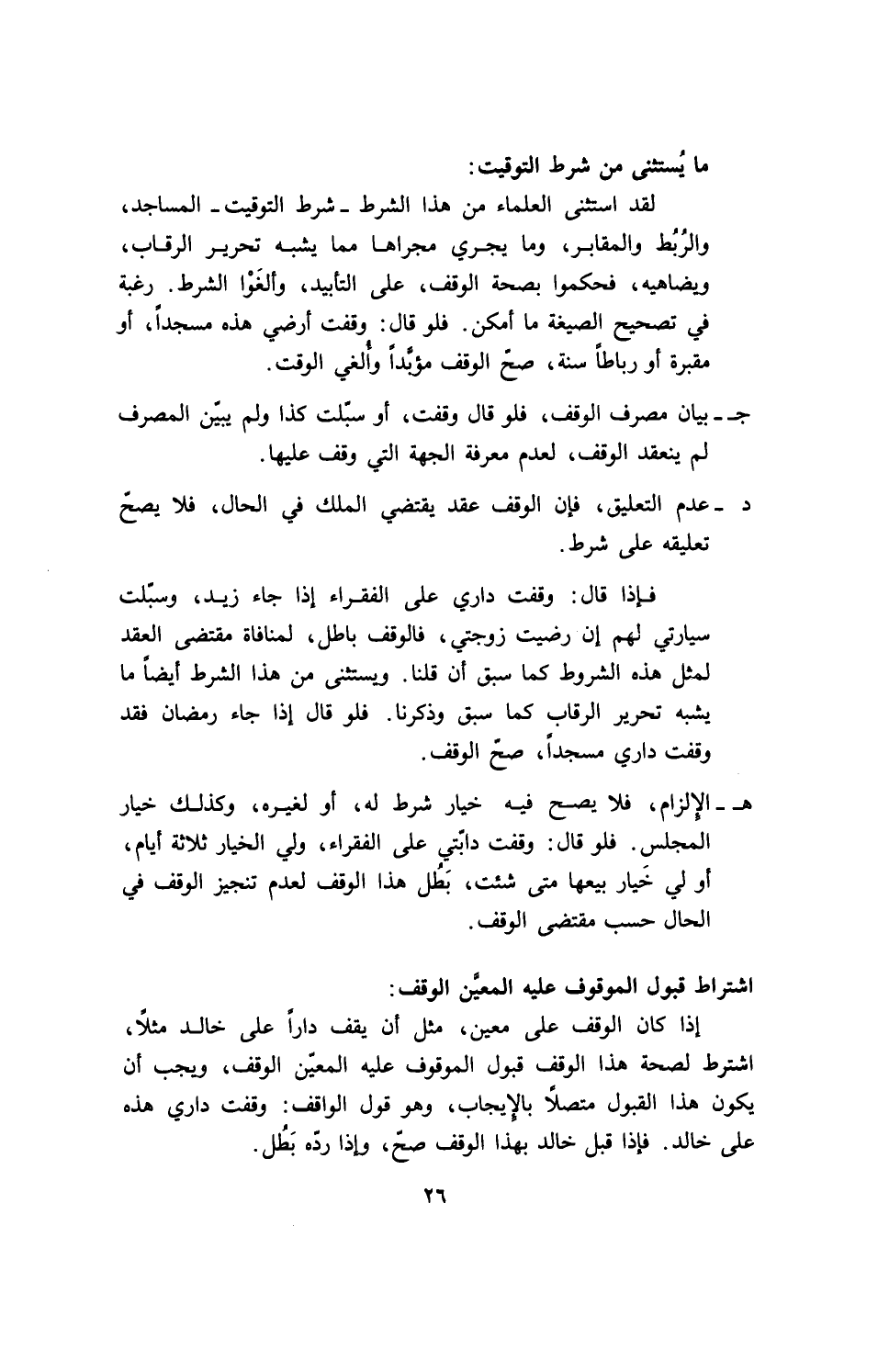 د- عدم التعليق، فإن الوقف عقد يقتضي الملك في الحال، فلا يصحّ تعليقه على شرط.