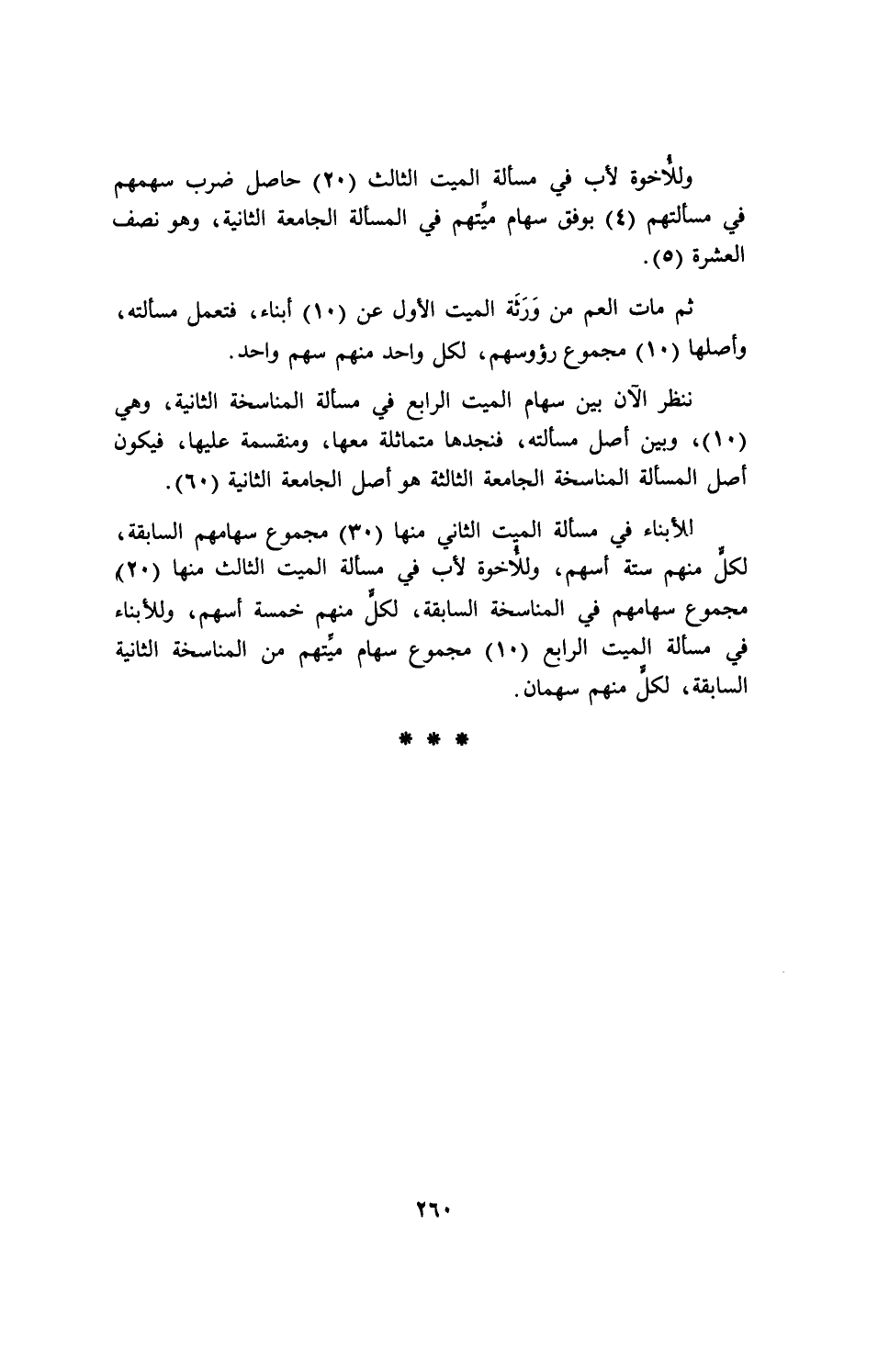 للأبناء في مسألة الميت الثاني منها (30) مجموع سهامهم السابقة، لكل منهم ستة أسهم، وللأخوة لأب في مسألة الميت الثالث منها (20) مجموع سهامهم في المناسخة السابقة، لكل منهم خمسة أسهم، وللأبناء في مسألة الميت الرابع (10) مجموع سهام ميتهم من المناسخة الثانية السابقة، لكل منهم سهمان.