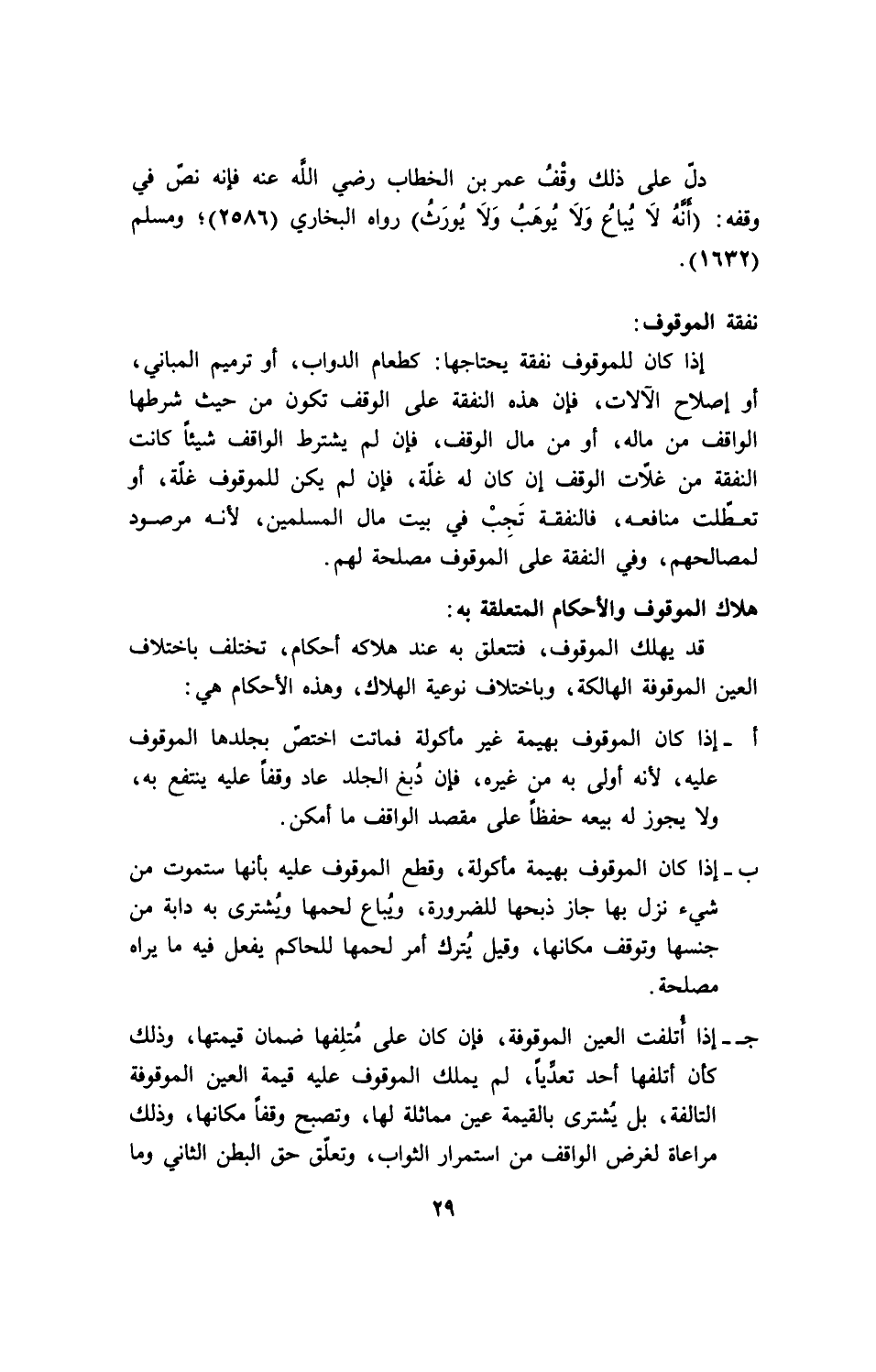 ب إذا كان الموقوف بهيمة مأكولة، وقطع الموقوف عليه بأنها ستموت من شئ نزل بها جاز ذبحها للضرورة، ويُباع لحمها ويُشترى به دابة من جنسها وتوقف مكانها، وقيل يُترك أمر لحمها للحاكم يفعل فيه ما يراه مصلحة.