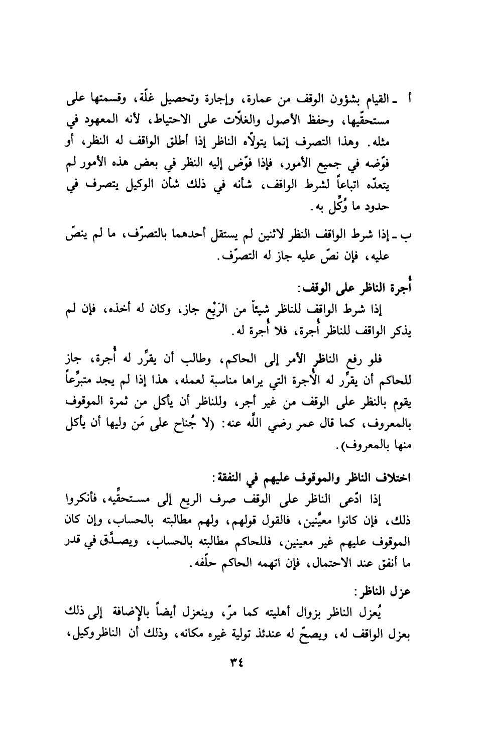 أالقيام بشؤون الوقف من عمارة، وإجارة وتحصيل غلّة، وقسمتها على مستحقيها، وحفظ الأصول والغلاّت على الاحتياط، لأنه المعهود في مثله. وهذا التصرف إنما يتولاّه الناظر إذا أطلق الواقف له النظر، أو فوّضه في جميع الأمور، فإذا فوّض إليه النظر في بعض هذه الأمر لم يتعدّه اتباعاً لشرط الواقف، شأنه في ذلك شأن الوكيل يتصرف في حدود ما وُكِّل به.