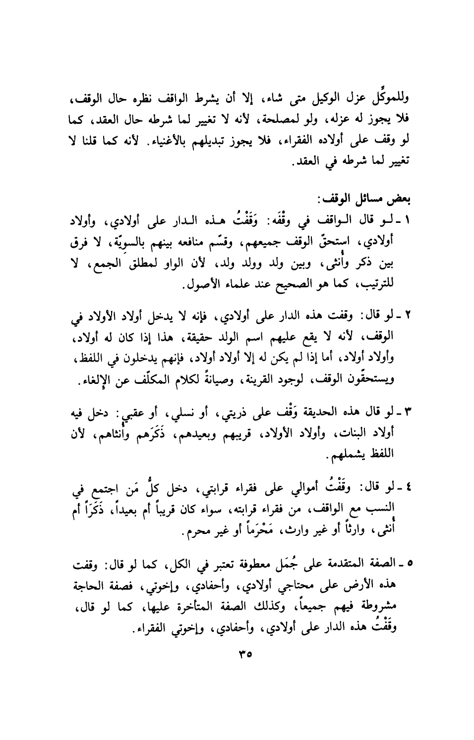 5 - الصفة المتقدمة على جمل معطوفة تعتبر في الكل، كما لو قال: وقفت هذه الأرض على محتاجي أولادي، وأحفادي، وإخوتي، فصفة الحاجة مشروطة فيهم جميعاً، وكذلك الصفة المتأخرة عليها، كما لو قال، وقفْتُ هذه الدار على أولادي، وأحفادي، وإخوتي الفقراء.
