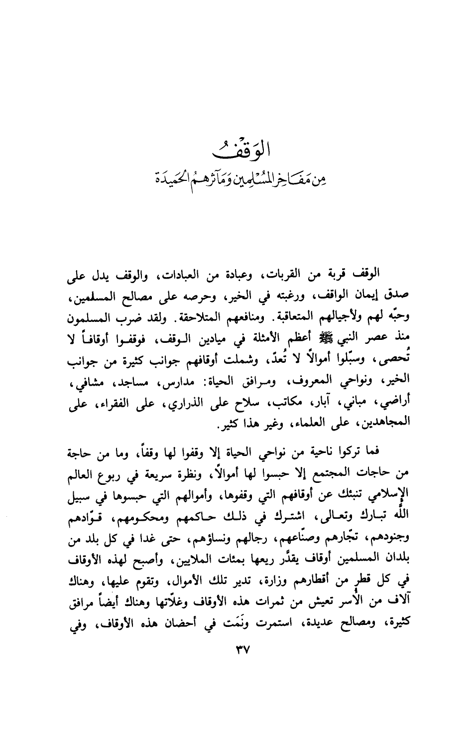 الوقف قربة من القربات، وعبادة من العبادات، والوقف يدل على صدق إيمان الواقف، ورغبته في الخير، وحرصه على مصالح المسلمين، وحبّة لهم ولأجيالهم المتعاقبة. ومنافعهم المتلاحقة. ولقد ضرب المسلمون منذ عصر النبي - صلى الله عليه وسلم - أعظم الأمثلة في ميادين الوقف، فوقفوا أوقافاً لا تُحصى، وسبّلوا أموالاً لا تُعدّ، شملت أوقافهم جوانب كثيرة من جوانب الخير، ونواحي المعروف، ومرافق الحياة: مدارس، مساجد، مشافي، أراضي، مباني، آبار، مكاتب، سلاح على الذراري، على الفقراء، على المجاهدين، على العلماء، وغير هذا كثير.