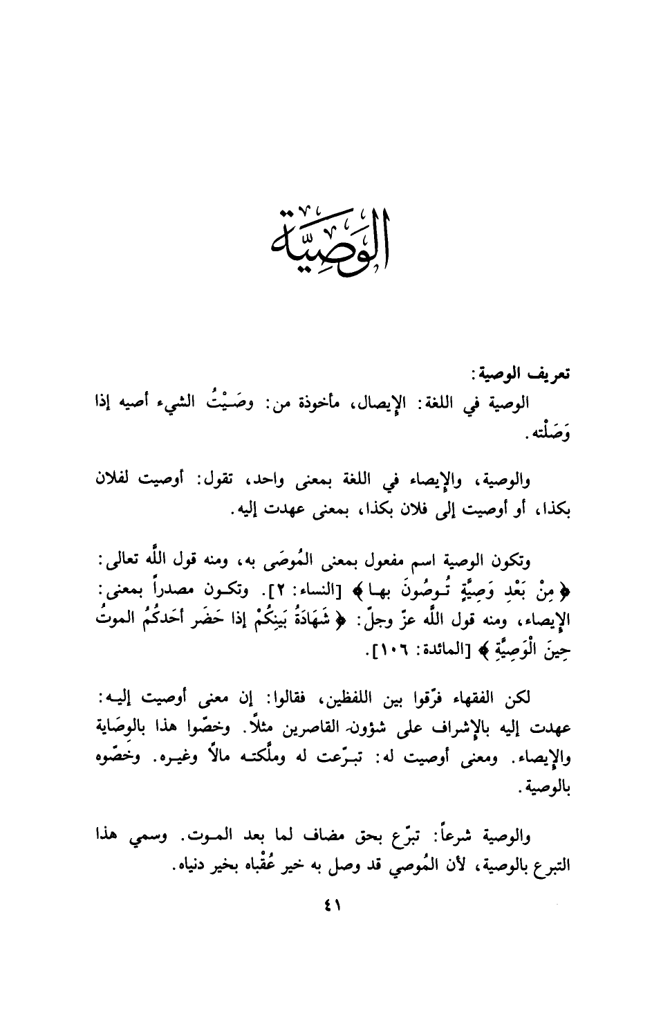 {مِن بَعْدِ وَصِيَّةٍ تُوصُونَ بِهَا} [النساء: 12]. وتكون مصدراً بمعنى: الإيصاء، ومنه قول الله عز وجل: {شَهَادَةُ بَيْنِكُمْ إِذَا حَضَرَ أَحَدَكُمُ الْمَوْتُ حِينَ الْوَصِيَّةِ} [المائدة: 106].