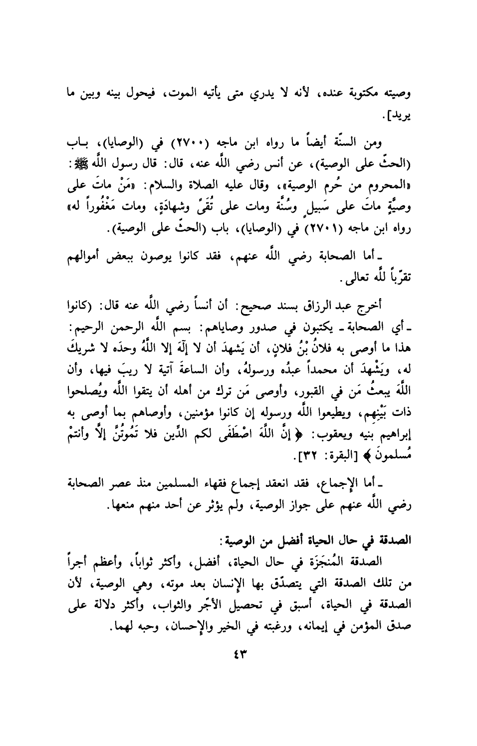 " المحروم من حُرم الوصية "، وقال عليه الصلاة والسلام: " من ماتَ على وصية مات على سبيل وسُنَّة ومات على تُقَىً وشهادة، ومات مغفوراً له " رواه ابن ماجه (2701) في (الوصايا)، باب (الحث على الوصية).