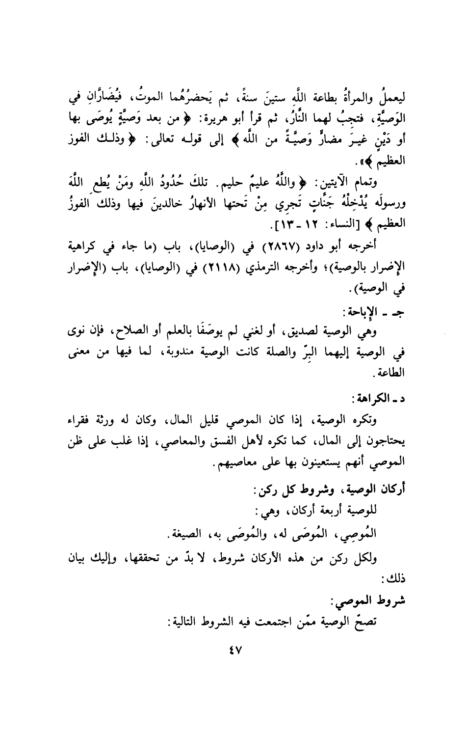ليعمل والمرأة بطاعة الله ستين سنة، ثم يحضرهما الموت، فيضاران في الوصية، فتجب لهما النار، ثم قرأ أبو هريرة: {مِن بَعْدِ وَصِيَّةٍ يُوصَى بِهَا أَوْ دَيْنٍ غَيْرَ مُضَآرٍّ وَصِيَّةً مِّنَ اللهِ} إلى قوله تعالى {وَذَلِكَ الْفَوْزُ الْعَظِيمُ} ".