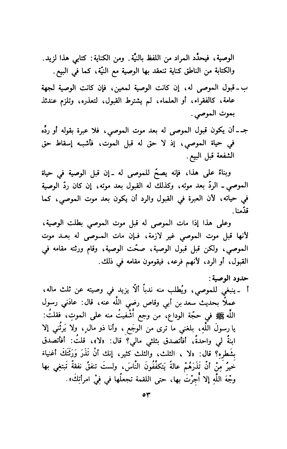 أينبغي للموصي، ويطلب منه ندباً ألا يزيد وصيته عن ثلث ماله، عملاً بحديث سعد بن أبي وقاص رضي الله عنه، قال: عادني رسول الله - صلى الله عليه وسلم - في حجة الوداع، من وجع أشفيت منه على الموت، فقلت: يا رسول الله، بلغني ما ترى من الوجع، وأنا ذو مال، ولا يرثني إلا ابنة لي واحدة، أفأتصدق بثلثي مالي؟ قال: " لا " قلت: أفأتصدق بشطره؟ قال: " لا "، الثلث، والثلث كثير، إنك أن تذر ورثتك أغنياء خير من أن تذرهم عالة يتكففون الناس، ولست تنفق نفقة تبتغي بها وجه الله إلا أجرت بها، حتى اللقمة تجعلها في في امرأتك ".