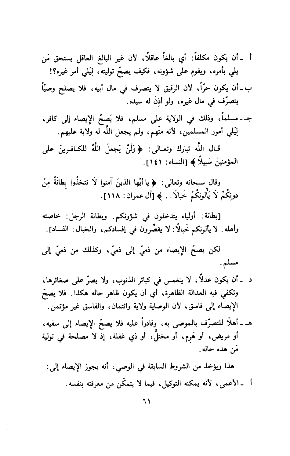 ج- مسلماً، وذلك في الولاية على مسلم، فلا يَصحّ الإيصاء إلى كافر، ليلى أمور المسلمين، لأنه متّهم، ولم يجعل الله له ولاية عليهم.