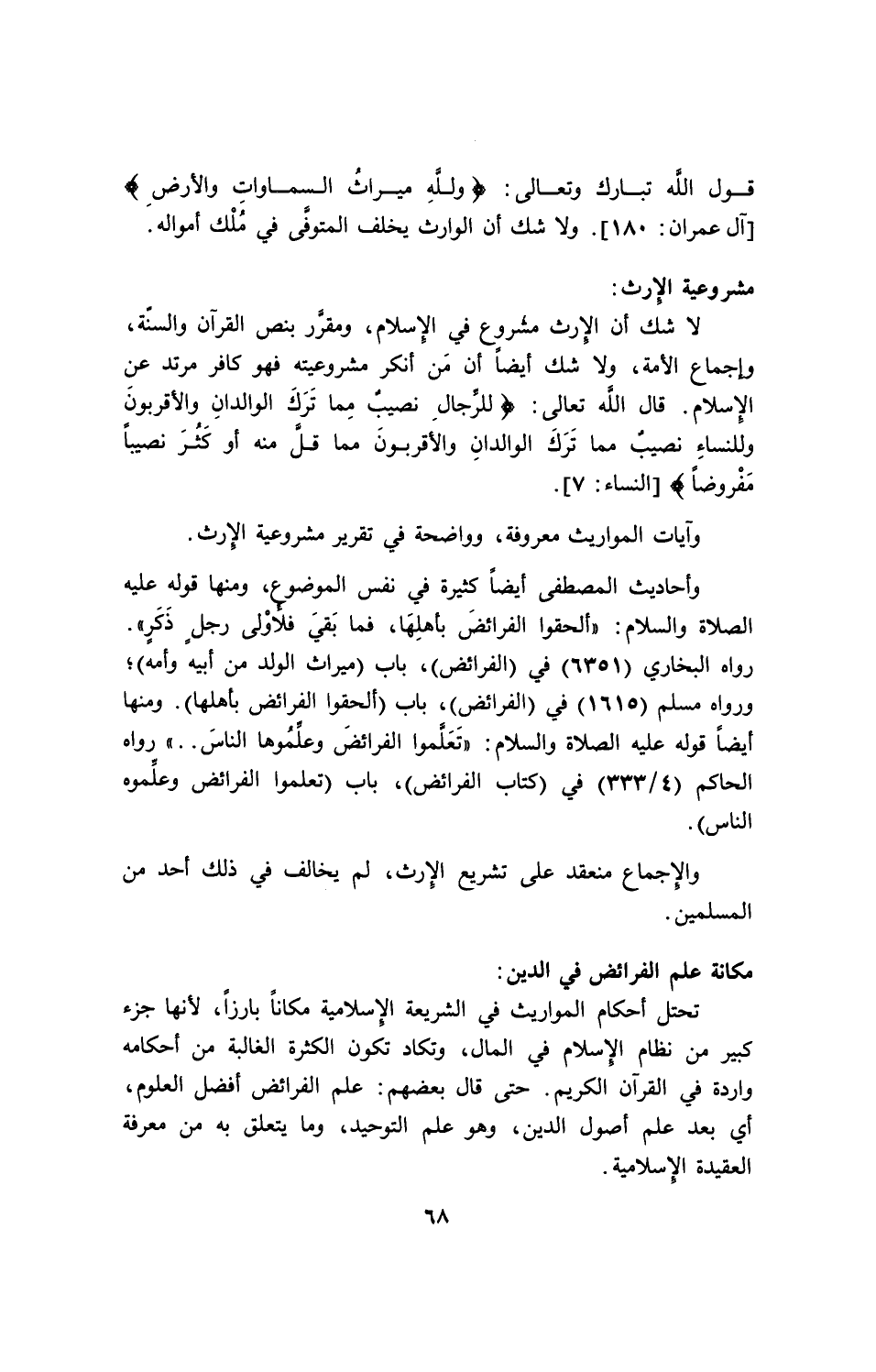 رواه البخاري (6351) في (الفرائض)، باب (ميراث الولد من أبيه وأمه)، ورواه مسلم (1615) في (الفرائض)، باب (ألحقوا الفرائض بأهلها). ومنها أيضاً قوله عليه الصلاة والسلام: " تعلموا الفرائض وعلموها الناس " رواه الحاكم (4/ 333) في (كتاب الفرائض)، باب (تعلموا الفرائض وعلموه الناس).