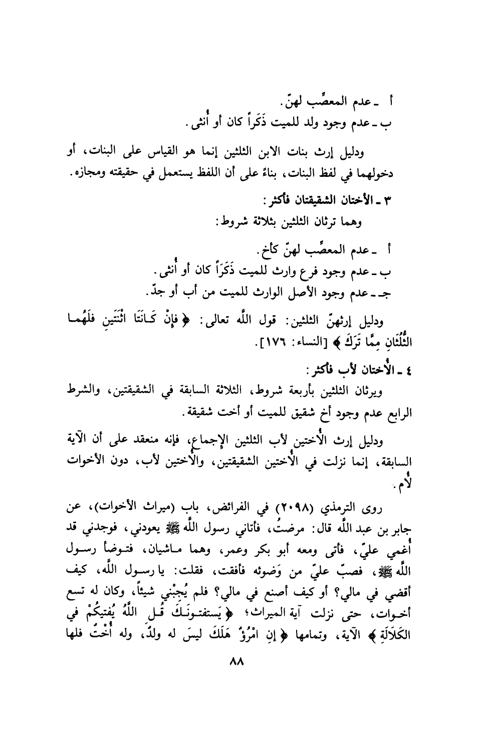 روى الترمذي (2098) في الفرائض، باب (ميراث الأخوات)، عن جابر بن عبدالله قال: مرضت، فأتاني رسول الله - صلى الله عليه وسلم - يعودني، فوجدني قد أغمى على، فأتى ومعه أبو بكر وعمر، وهما ماشيان، فتوضأ رسول الله - صلى الله عليه وسلم -، فصب علي من وضوئه فأفقت، فقلت: يا رسول الله، كيف أقضي في مالي؟ أو كيف أصنع في مالي؟ فلم يجبني شيئاً، وكان له تسع أخوات، حتى نزلت آية الميراث، {يَسْتَفْتُونَكَ قُلِ اللهُ يُفْتِيكُمْ فِي الْكَلاَلَةِ} الآية، وتمامها {إِنِ امْرُؤٌ هَلَكَ لَيْسَ لَهُ وَلَدٌ وَلَهُ أُخْتٌ فَلَهَا