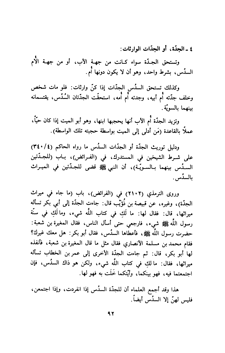 ودليل توريث الجدة أو الجدات السدس ما رواه الحاكم (4/ 340) على شرط الشيخين في المستدرك، في (الفرائض)، باب (للجدتين السدس بينهما بالسوية)، أن النبي - صلى الله عليه وسلم - قضى للجدتين في الميراث بالسدس.