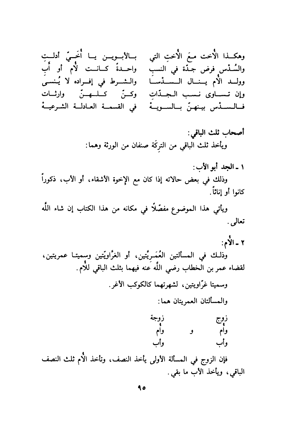 وذلك في المسألتين لعمريتين، أو الغراويتين وسميتا عمرتين، لقضاء عمر بن الخطاب رضي الله عنه فيهما بثلث الباقي للأم.