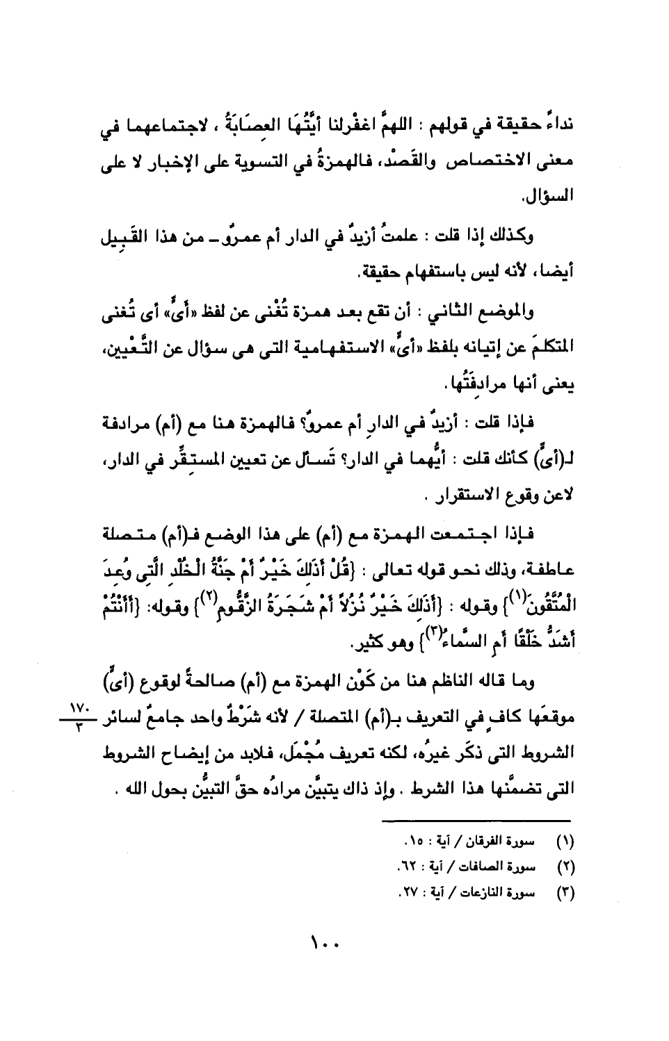 فإذا اجتمعت الهمزة مع (أم) على هذا الوضع فـ (أم) متصلة عاطفة، وذلك نحو قوله تعالى: {قل أذلك خير أم جنة الخلد التي وعد المتقون} وقوله: {أذلك خير نزلًا أم شجرة الزقوم} وقوله: {أأنتم أشد خلقًا أم السماء} وهو كثير.