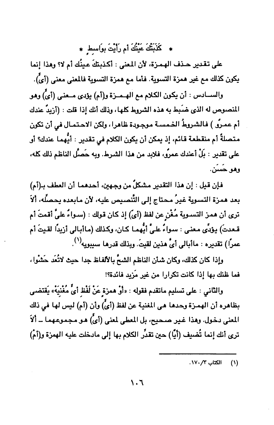 والسادس: أن يكون الكلام مع الهمزة و (أم) يؤدي معنى (أي) وهو المنصوص له الذي ضبط به هذه الشروط كلها، وذلك أنك إذا قلت: (أزيد عندك أم عمرو) فالشروط لخمسة موجودة ظاهرًا، ولكن الاحتمال في أن تكون متصلة أم منقطعة قائم، إذ يمكن أن يكون الكلام في تقدير: أيهما عندك؟ أو على تقدير: بل أعندك عمرو، فلابد من هذا الشرط. وبه حصل الناظم ذلك كله، وهو حسن.