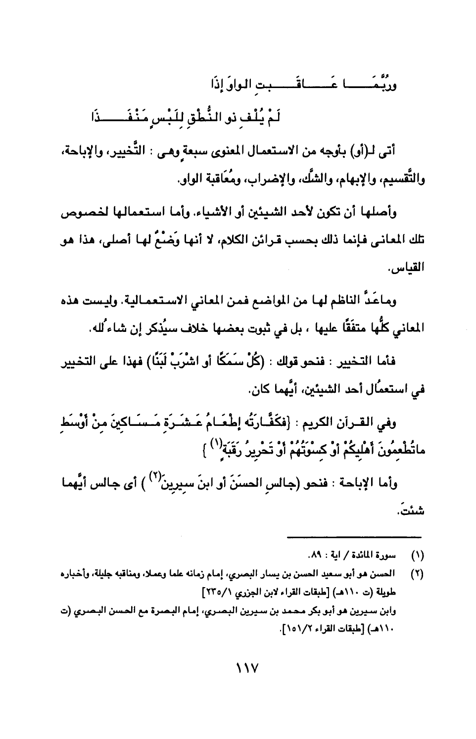 وأما الإباحة: فنحو (جالس الحسن أو ابن سيرين) أي جالس أيهما شئت.