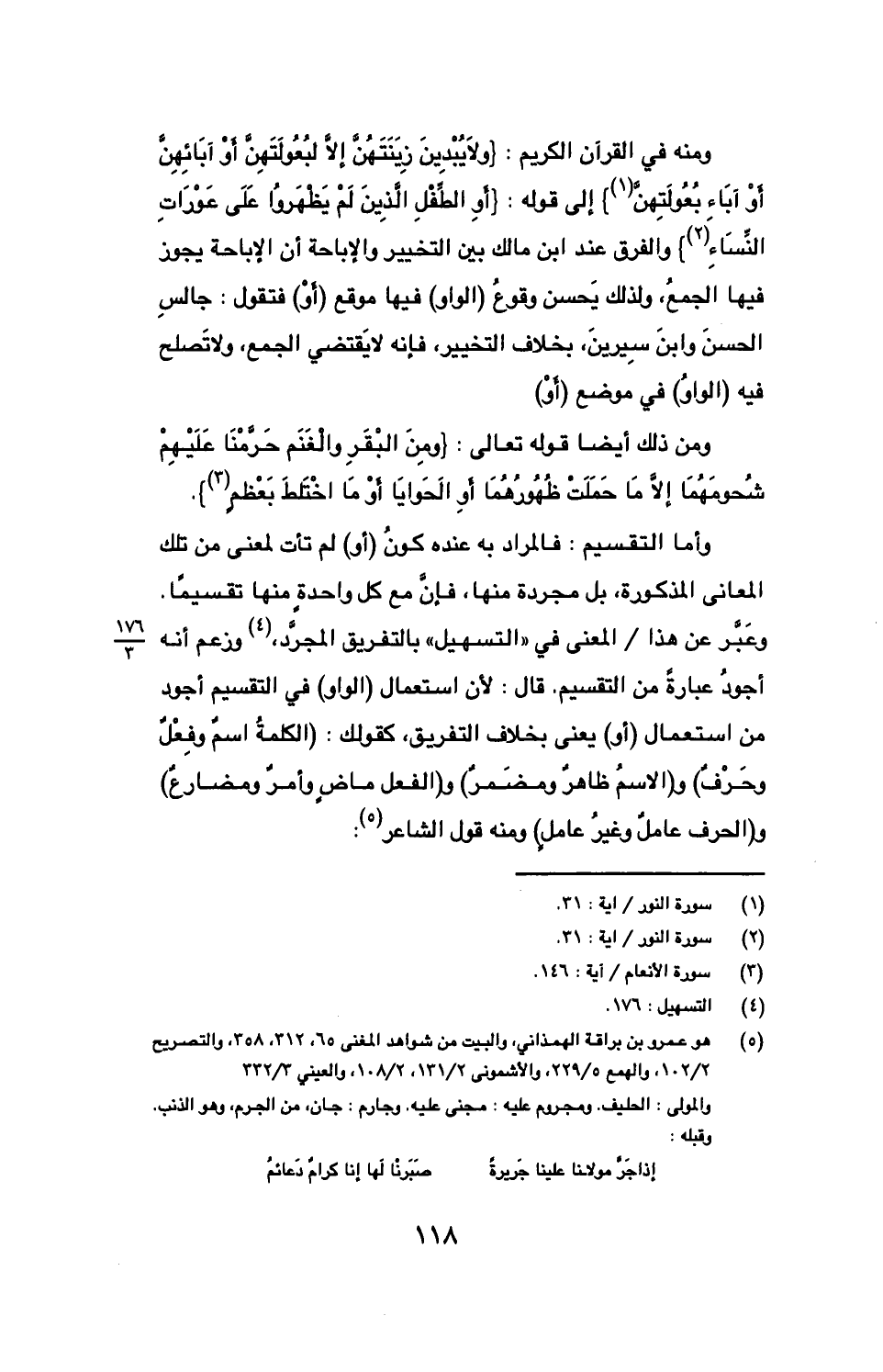 ومنه في القرآن الكريم: {ولا يبدين زينتهن إلا لبعولتهن أو آبائهن أو آباء بعولتهن} إلى قوله: {أو الطفل الذين لم يظهروا على عورات النساء} والفرق عند ابن مالك بين التخيير والإباحة أن الإباحة يجوز فيها الجمع، ولذلك يحسن وقوع (الواو) فيها موقع (أو) فتقول: جالس الحسن وابن سيرين، بخلاف التخيير، فإنه يقتضي الجمع، ولا تصلح فيه (الواو) في موضع (أو).