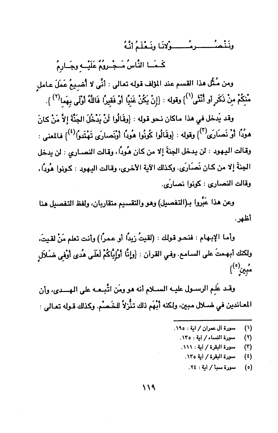 ومن مثل هذا القسم عند المؤلف قوله تعالى: {أني لا أضيع عمل عامل منكم من ذكر أو أنثى} وقوله: {إن يكن غنيًا أو فقيرًا فالله أولى بهما}.