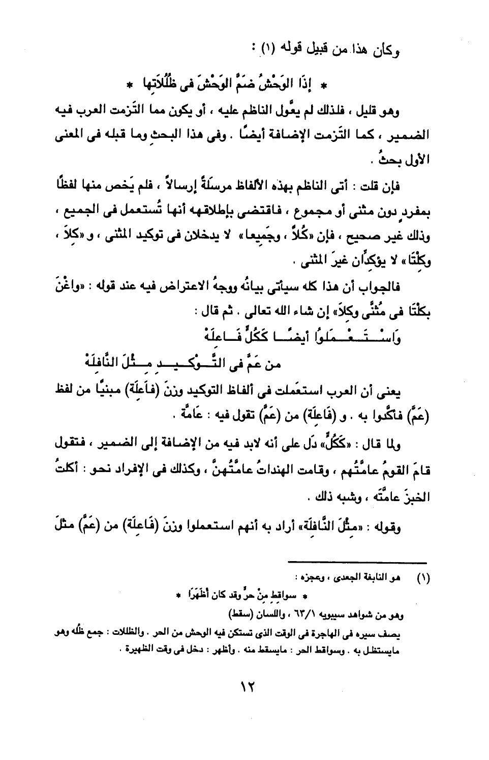 ولما قال: "ككلٍّ" دل على أنه لابد فيه من الإضافة إلى الضمير، فتقول قام القوم عامتهم، وقامت الهندات عامَّتُهنَّ، وكذلك في الإفراد نحو: أكلت الخبزَ عامَّتَه، وشبه ذلك.