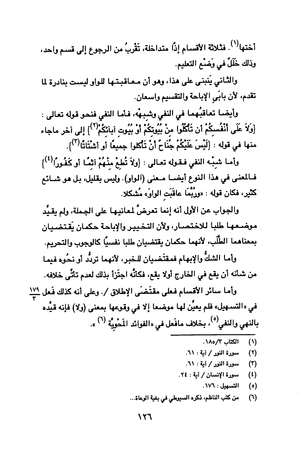 وأيضًا تعاقبهما في النفي وشبهه، فأما النفي فنحو قوله تعالى: {ولا على أنفسكم أن تأكلوا من بيوتكم أو بيوت أبائكم} إلى آخر ما جاء منها في قوله: {ليس عليكم جناح أن تأكلوا جميعًا أو أشتاتًا}.