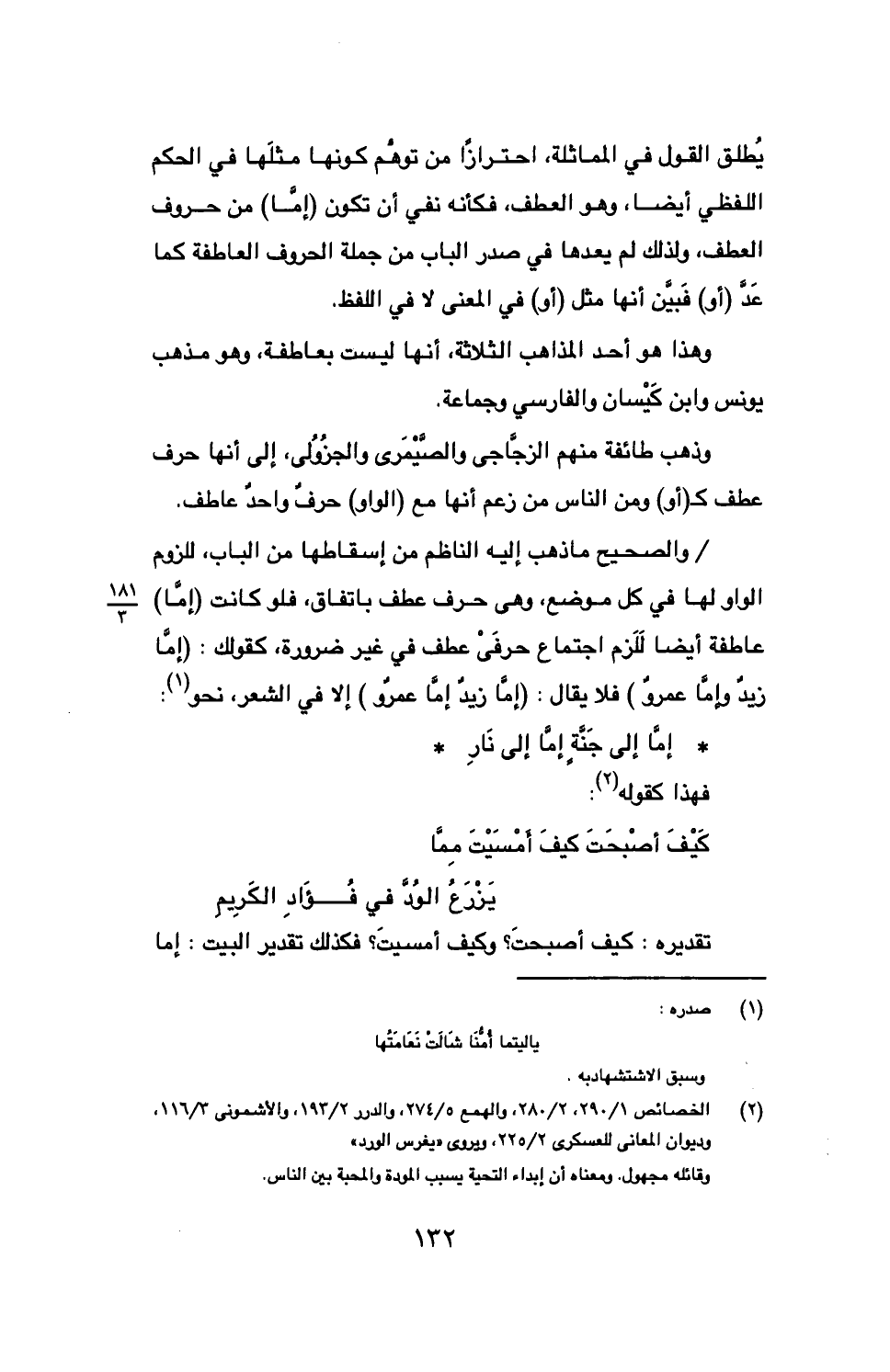 والصحيح ما ذهب إليه الناظم من إسقاطها من الباب، للزوم الواو لها في كل موضع، وهي حرف عطف باتفاق، فلو كانت (إما) عاطفة أيضًا للزم اجتماع حرفي عطف في غير ضرورة، كقولك: (إما زيد وإما عمرو) فلا يقال: (إما زيد إما عمرو) إلا في الشعر، نحو: