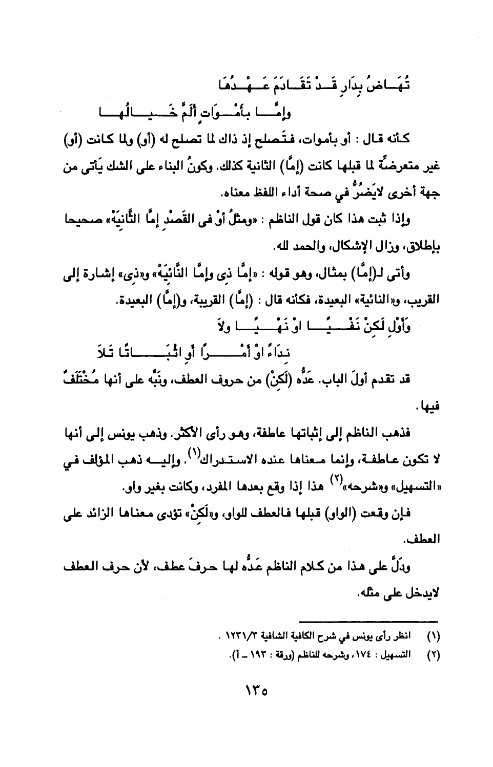 فذهب الناظم إلى أثباتها عاطفة، وهو رأي الأكثر. وذهب إلى أنها لا تكون عاطفة، وإنما معناها عنده الاستدراك. وإليه ذهب المؤلف في "التسهيل" و "شرحه" هذا إذا وقع بعدها المفرد، وكانت بغير واو.