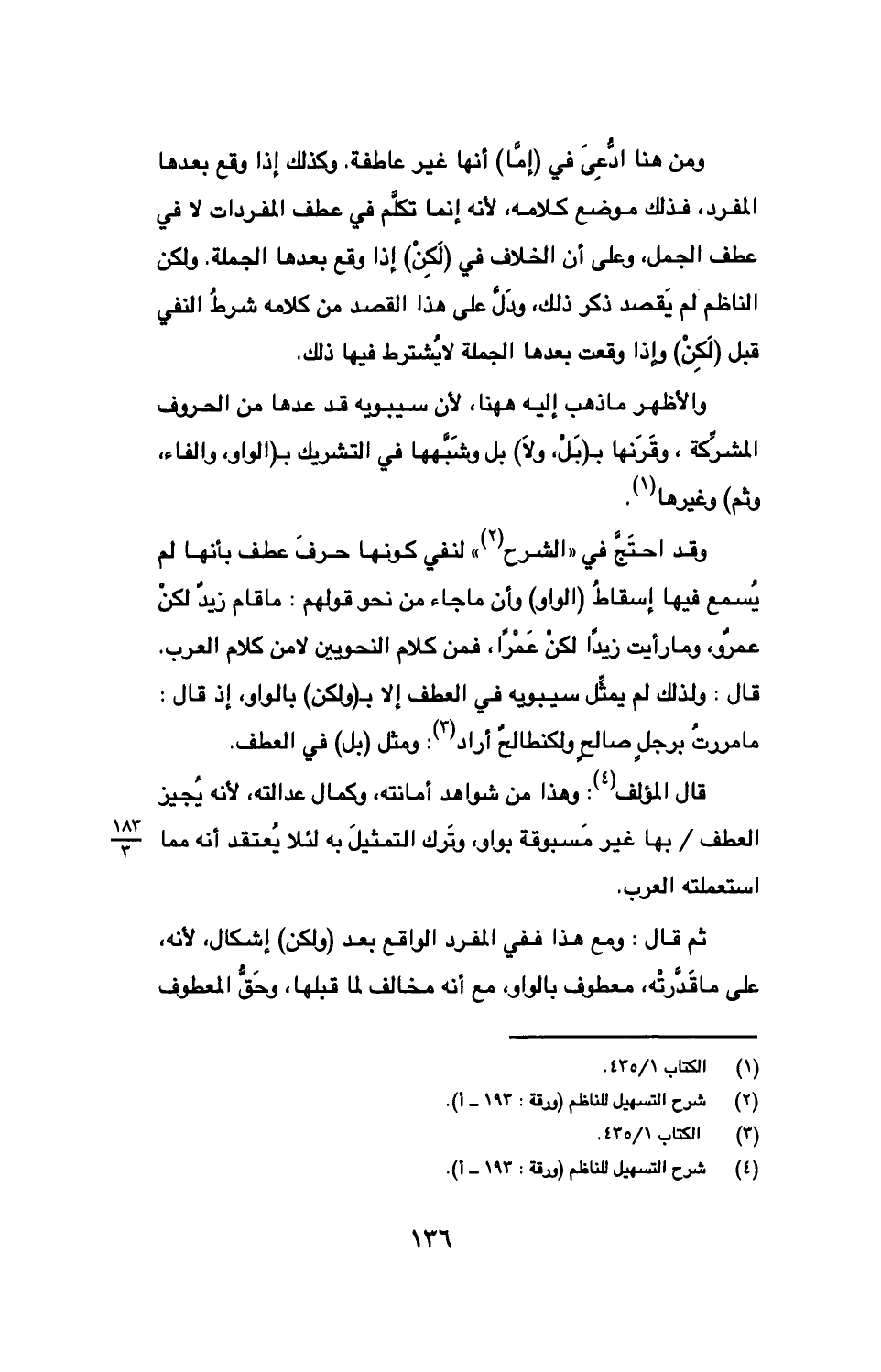 وقد احتج في "الشرح" لنفي كونها حرف عطف بأنها لم يسمع فيها إسقاط (الواو) وأن ما جاء من نحو قولهم: ما قام زيد لكن عمرو، وما رأيت زيدًا لكن عمرًا، فمن كلام النحويين لا من كلام العرب. قال: ولذلك لم يمثل سيبويه في العطف إلا بـ (ولكن) بالواو، إذ قال: ما مرت برجل صالح ولكن طالح أراد: ومثل (بل) في العطف.
