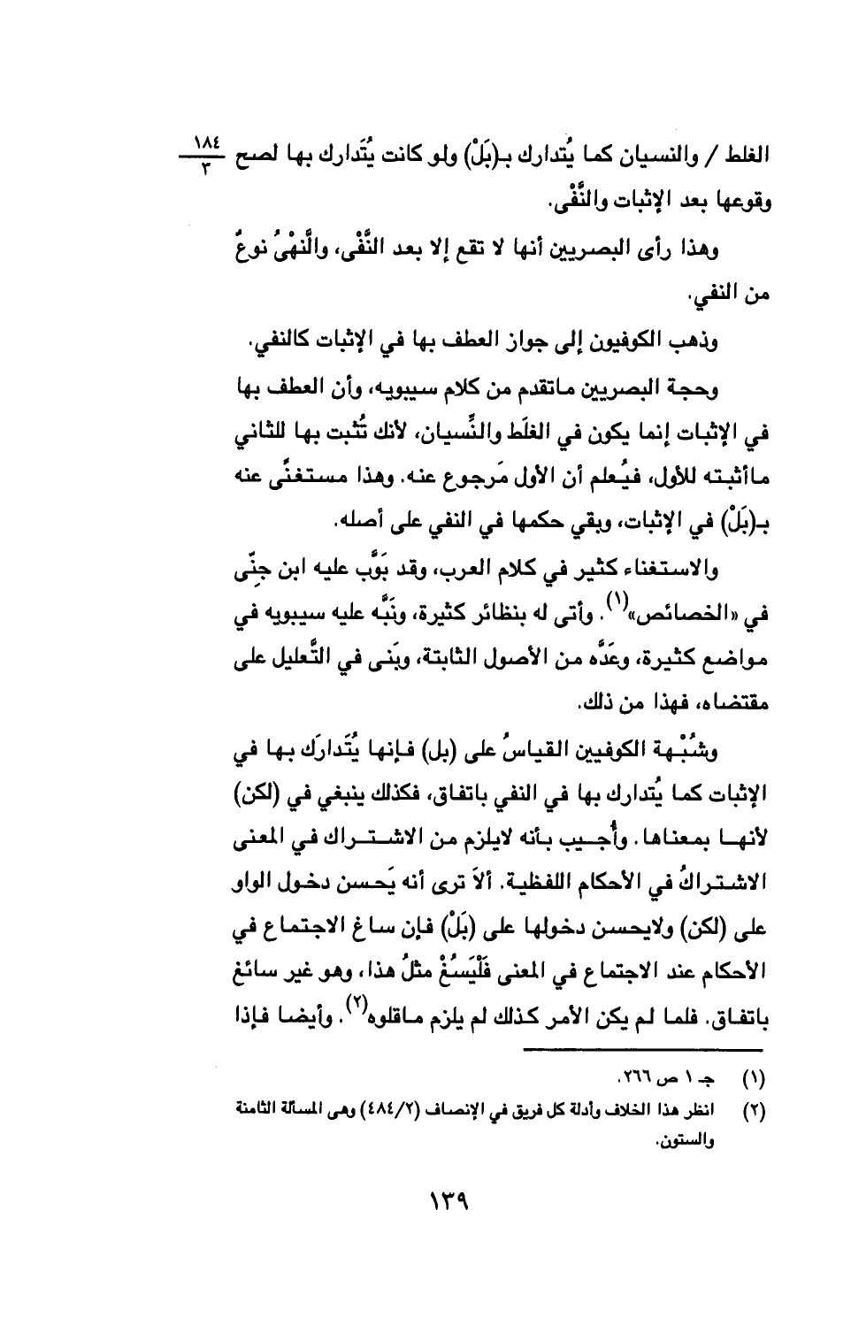 وذهب الكوفيون إلى جواز العطف بها في الإثبات كالنفي. وحجة البصريين ما تقدم من كلام سيبويه، وأن العطف بها في الإثبات إنما يكون في الغلط والنسيان، لأنك تثبت بها للثاني ما أثبته للأول، فيعلم أن الأول مرجوع عنه. وهذا مستغني عنه بـ (بل) في الإثبات، وبقي حكمها في النفي على أصله.