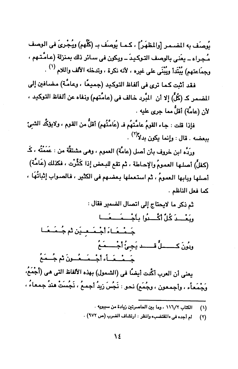 فقد أثبت كما ترى في ألفاظ التوكيد (جميعاً، وعامّة) مضافين إلى المضمر كـ (كلٍّ) إلا أن المبرّد خالف فى (عامّتهم) ونفاه عن ألفاظ التوكيد. لأن (عامة) أقل مما جرى عليه.