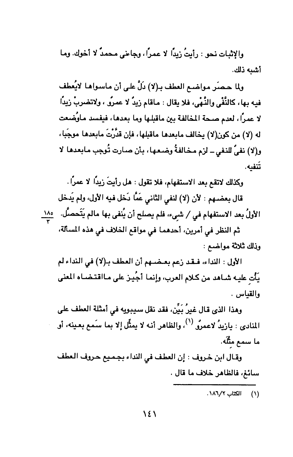 وهذا الذي قال غير بين، فقد نقل سيبويه في أمثلة العطف على المنادي: يا زيد لا عمرو، والظاهر أنه لا يمثل إلا يمثل إلا بما سمع بعينه، أو ما سمع مثله.