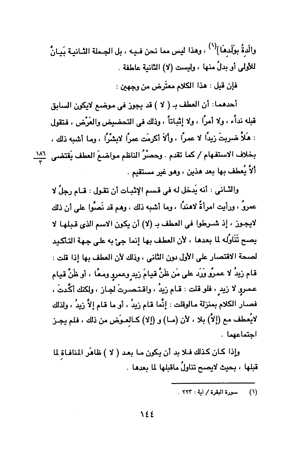 والدة بولدها}، وهذا ليس مما نحن فيه، بل الجملة الثانية بيان للأولى أو بدل منها، وليست (لا) الثانية عاطفة.