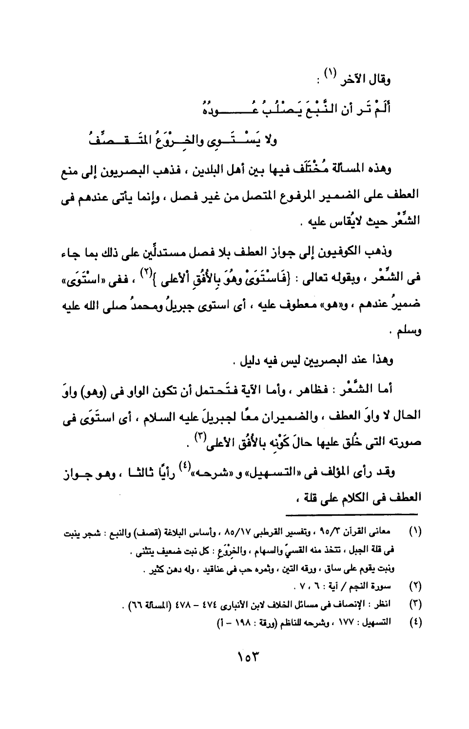 وذهب الكوفيون إلى جواز العطف بلا فصل مستدلين على ذلك بما جاء في الشعر، وبقوله تعالى: {فاستوي وهو بالأفق الأعلى}، ففي "استوي" ضمير عندهم، و"هو" معطوف عليه، أي استوي جبريل ومحمد صلى الله عليه وسلم.
