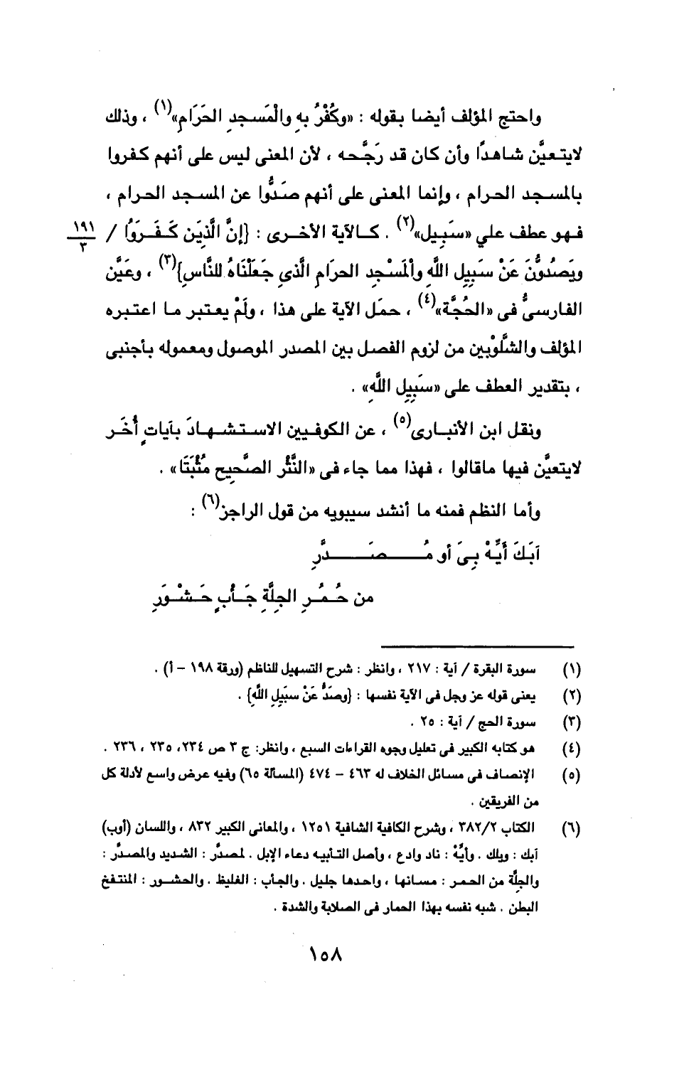 واحتج المؤلف أيضًا بقوله: "وكفر به والمسجد الحرام"، وذلك لا يتعين شاهدًا وأن كان قد رجحه، لأن المعنى ليس على أنهم كفروا بالمسجد الحرام، وإنما المعنى على أنهم صدوا على المسجد الحرام، فهو عطف على "سبيل". كالآية الأخرى: {إن الذين كفروا ويصدون عن سبيل الله والمسجد الحرام الذي جعلناه للناس}، وعين الفارسي في "الحجة"، حمل الآية على هذا، ولم يعتبر ما اعتبره المؤلف الشلوبين من لزوم الفصل بين المصدر الموصول ومعمولة بأجنبي، بتقدير العطف على "سبيل الله".