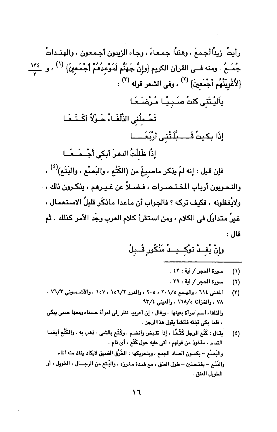 رأيت زيداً أجمع، وهنداً جمعاء، وجاء الزيدون أجمعون، والنهدات جمع. ومنه في القرآن الكريم {وإنّ جهنم لموعدهم أجمعين} (¬1)، و {لأغوينّهم أجمعين} (¬2)، وفى الشعر قوله (¬3):