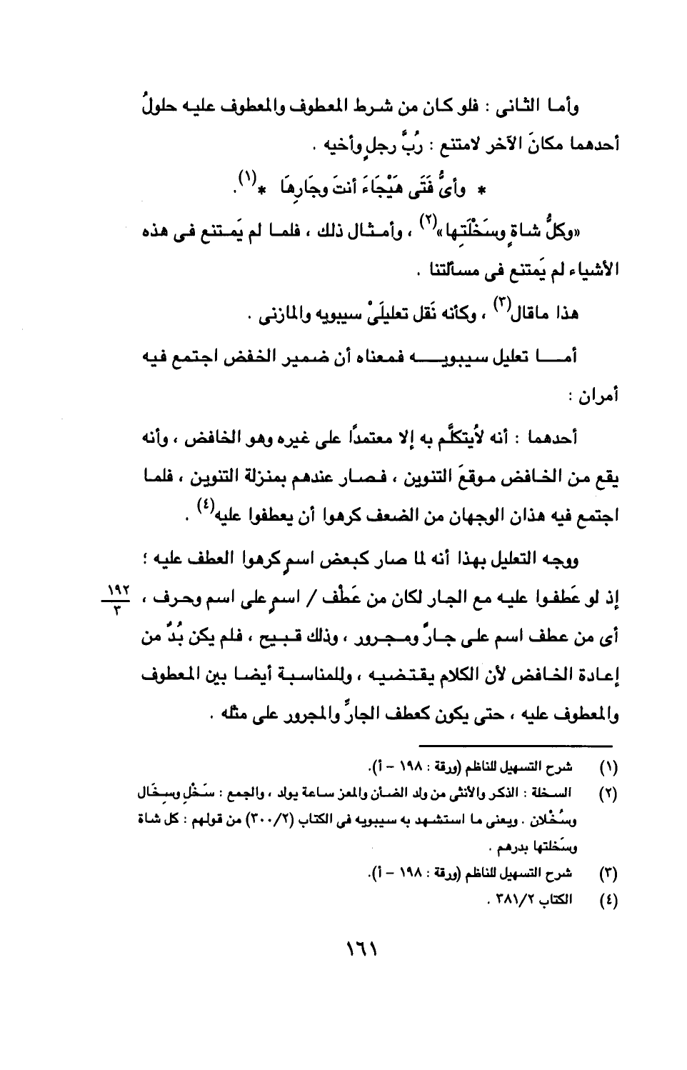 ووجه التعليل بهذا أنه لما صار كبعض اسمٍ كرهوا العطف عليه؛ إذ لو عطفوا عليه مع الجار لكان من عطف / اسمٍ على اسم وحرف، أي من عطف اسم على جاًر ومجرور، وذلك قبيح، فلم يكن بد من إعادة الخافض لأن الكلام يقتضيه، وللمناسبة أيضا بين المعطوف والمعطوف عليه، حتى يكون كعطف الجار والمجرور على مثله.