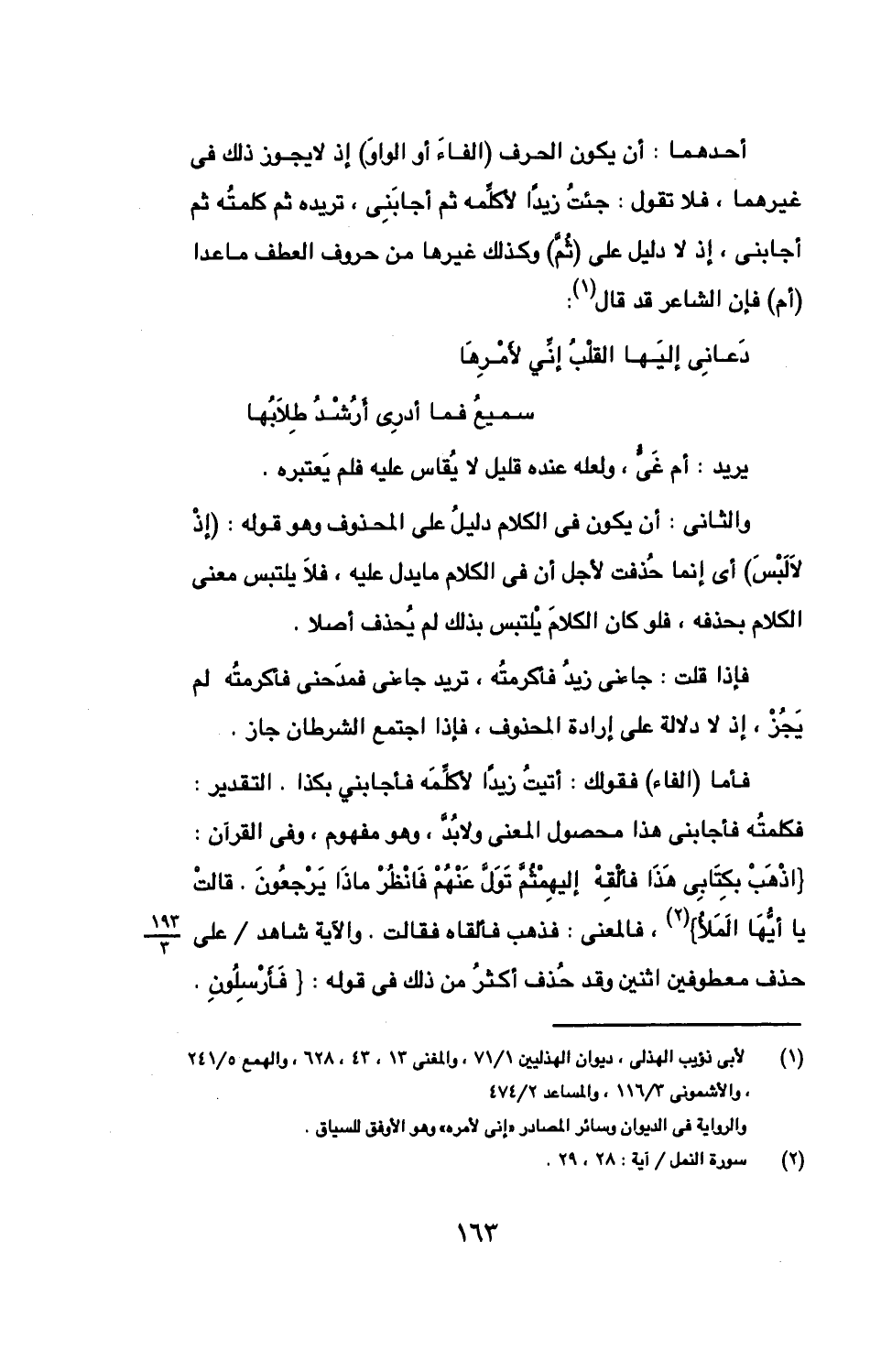 فأما (الفاء) فقولك: أتيت زيدًا لأكلمه فأجابني بكذا. التقدير: فكلمته فأجابني هذا محصول المعنى ولابد، وهو مفهوم، وفي القرآن: } اذهب بكتابي هذا فألقه إليهم ثم تول عنهم فانظر ماذا يرجعون. قالت يا أيها الملأ {، فالمعنى: فذهب فألقاه فقالت. والآية شاهد / على حذف معطوفين اثنين وقد حذف أكثر من ذلك في قوله: } فأرسلون