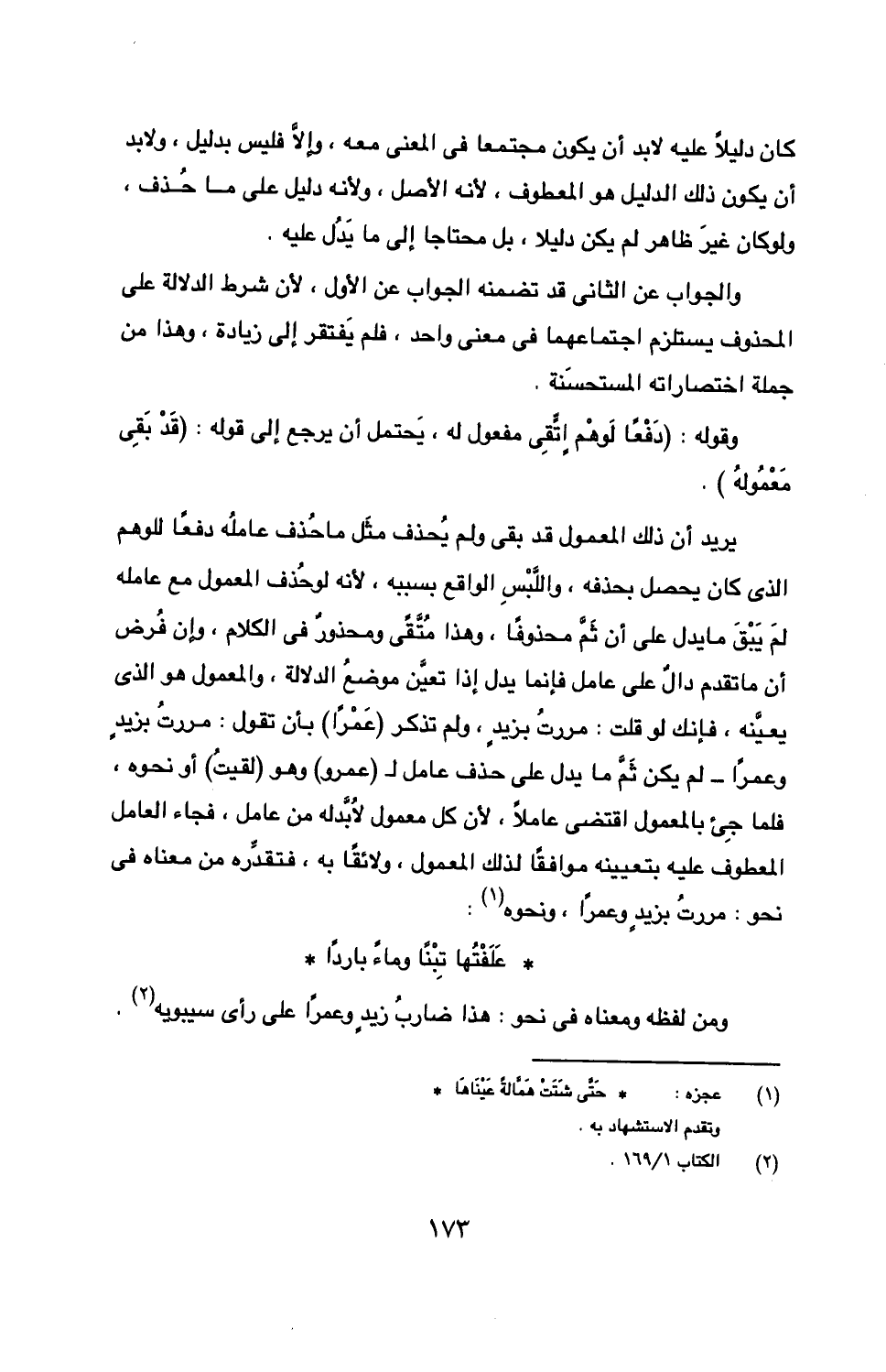 يريد أن ذلك المعمول قد بقى ولم يحذف مثل ما حذف عامله دفعًا للوهم الذي كان يحصل بحذفه، واللبس الواقع بسببه، لأنه لو حذف المعمول معه عامله لم يبق ما يدل على أن ثم محذوفًا، وهذا متقًى ومحذور في الكلام، وإن فرض أن ما تقدم دال على عامل فإنما يدل إذا تعين موضع الدلالة، والمعمول هو الذي يعينه، فإنك لو قلت: مررت بزيدٍ، ولم تذكر (عمرًا) بأن تقول: مررت بزيدٍ وعمرًا - لم يكن ثم ما يدل على حذف عامل لـ (عمرو) وهو (لقيت) أو نحوه، فلما جئ بالمعمول اقتضى عاملاً، لأن كل معمول لابد له من عامل، فجاء العامل المعطوف عليه بتعيينه موافقًا لذلك المعمول، ولائقًا به، فتقدره من معناه في نحو: مررت بزيدٍ وعمرًا، ونحوه:
