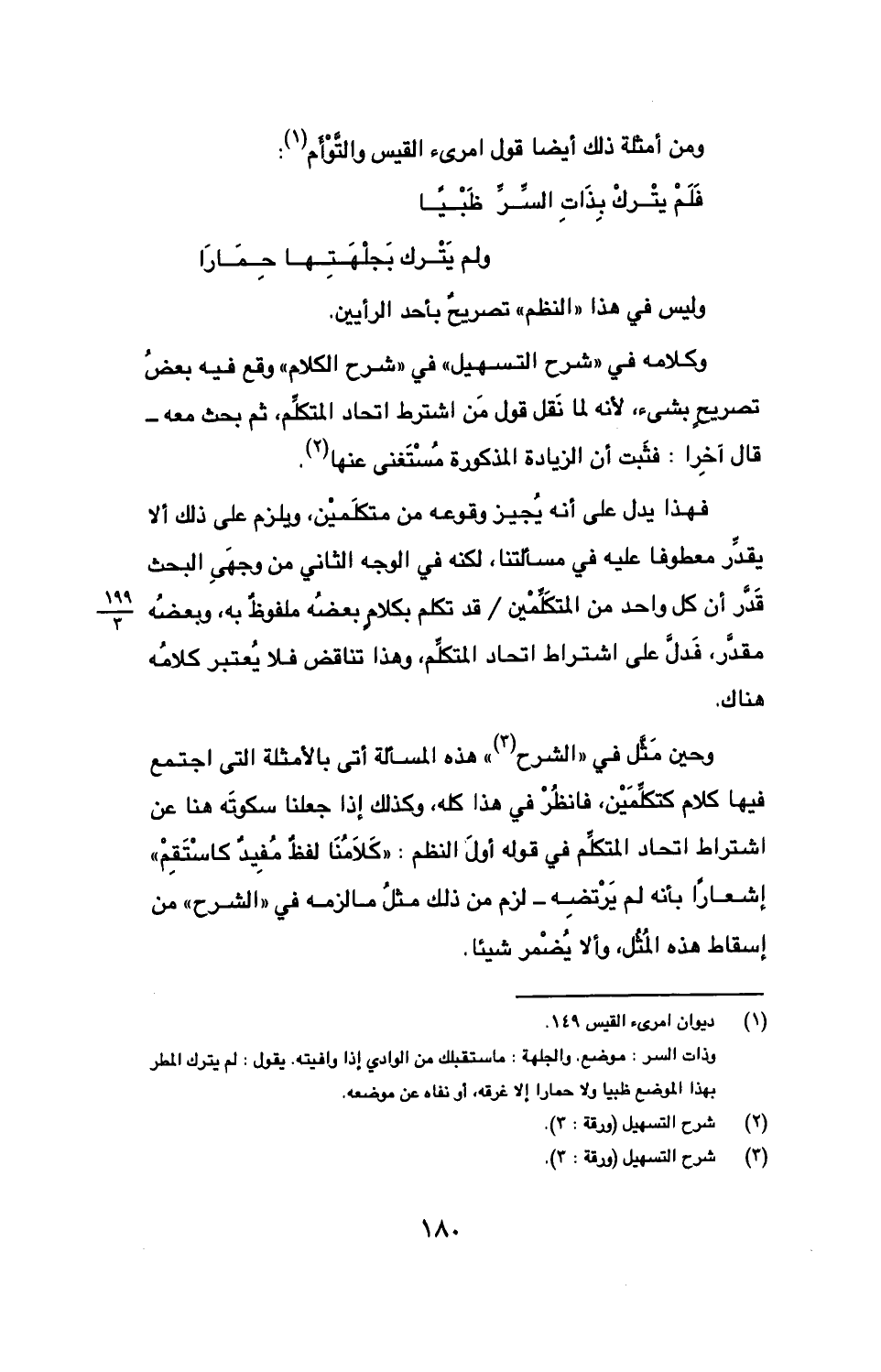 وحين مثل في "الشرح" هذه المسألة أتى بالأمثلة التي اجتمع فيها كلام كتكلمين، فانظر في هذا كله، وكذلك إذا جعلنا سكوته هنا عن اشتراط اتحاد المتكلم في قوله أول النظرم: "كلامنا لفظ مفيد كاستقم" إشعارًا بأنه لم يرتضه - لزم من ذلك مثل ما لزمه في "الشرح" من إسقاط هذه المثل، وألا يضمر شيئا.