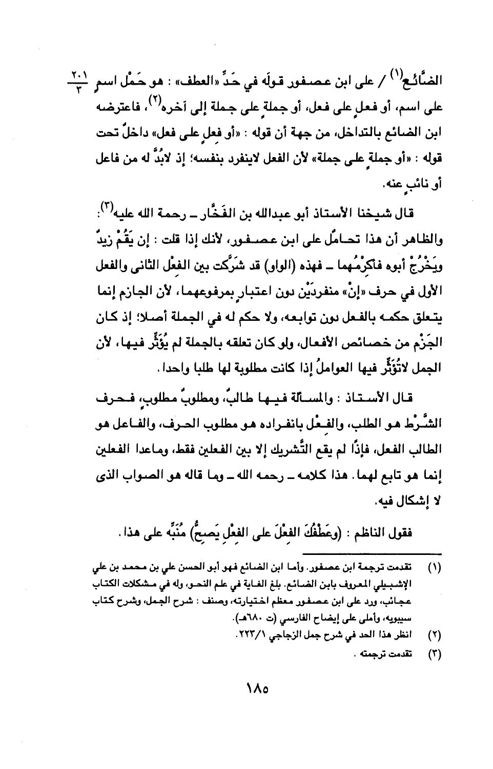 قال شيخنا الأستاذ أبو عبد الله بن الفخار - رحمه الله عليه: والظاهر أن هذا تحامل على ابن عصفور، لأنك إذا قلت: إن يقم زيد ويخرج أبوه فأكرمهما - فهذه (الواو) قد شركت بين الفعل الثاني والفعل الأول في حرف "إن" منفردين دون اعتبارٍ بمرفوعهما، لأن الجازم إنما يتعلق حكمه بالفعل دون توابعه، ولا حكم له في الجملة أصلا؛ إذ كان الجزم من خصائص الأفعال، ولو كان تعلقه بالجملة لم يؤثر فيها، لأن الجمل لا تؤثر فيها العوامل إذا كانت مطلوبة لها طلبا واحدا.