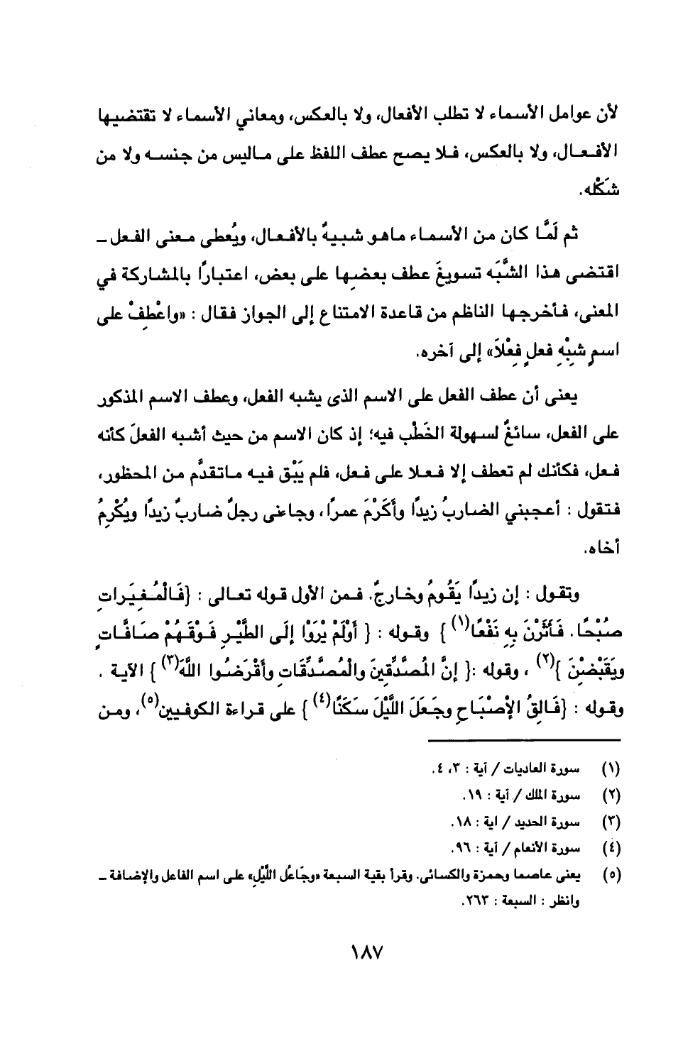وتقول: إن زيدًا يقوم وخارج. فمن الأول قوله تعالى: } فالمغيرات صبحًا. فأثرن به نفعًا {وقوله: } أولم يروا إلى الطير فوقهم صافاتٍ ويقبضن {، وقوله: } إن لمصدقين والمصدقات وأقرضوا الله {الآية، وقوله: } فالق الإصباح وجعل الليل سكنًا {على قراءة الكوفيين، ومن