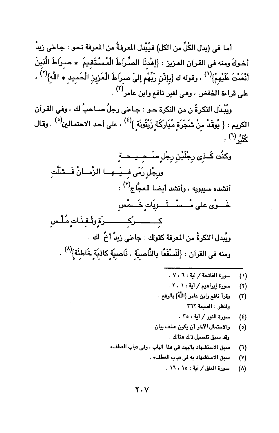 أما في (بدل الكل من الكل) فيبدل المعرفة من المعرفة نحو: جاءني زيد أخوك ومنه في القرآن العزيز: } إهدنا الصراط المستقيم * صراط الذين أنعمت عليهم {، وقوله: } بإذن ربهم إلى صراط العزيز الحميد * الله {، على قراءة الخفض، وهي لغير نافع وابن عامر.