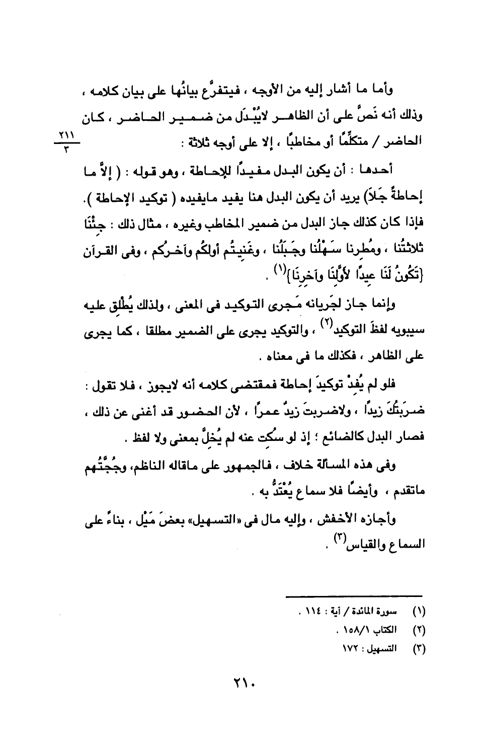 أحدها: أن يكون البدل مفيدًا للإحاطة، وهو قوله: (إلا ما إحاطًة جلا) يريد أن يكون البدل هنا يفيد ما يفيده (توكيد الإحاطة). فإذا كان كذلك جاز البدل من ضمير المخاطب وغيره، مثال ذلك: جئنا ثلاثتنا، ومطرنا سهلنا وجبلنا، وغنيتم أولكم وآخركم، وفي القرآن} تكون لنا عيدًا لأولنا وآخرنا {.
