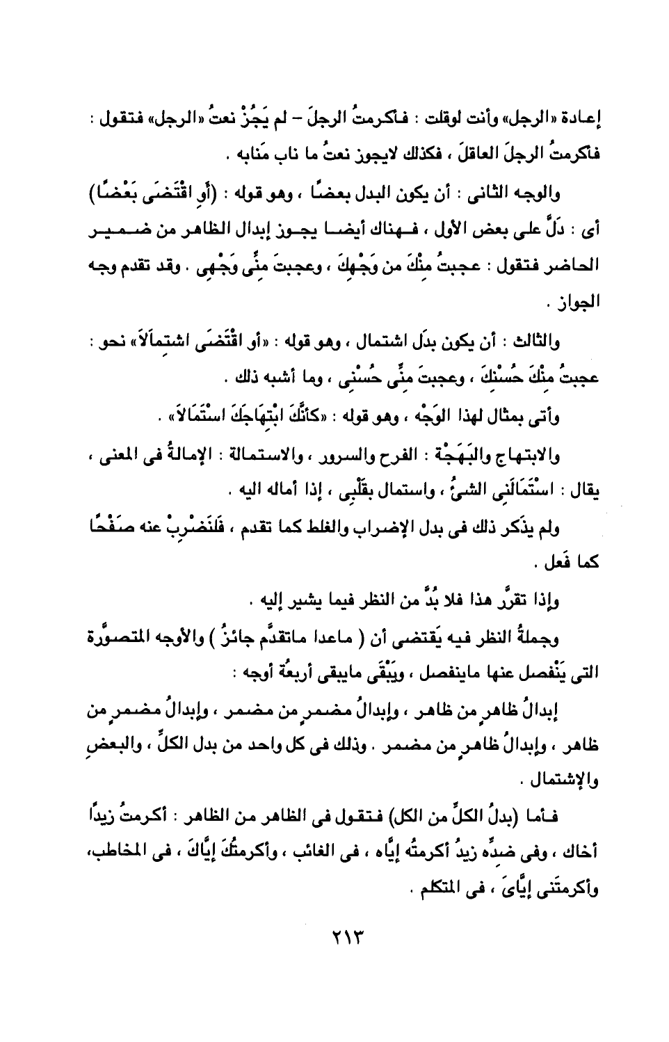 فأما (بدل الكل من الكل) فتقول في الظاهر من الظاهر: أكرمت زيدًا أخاك، وفي ضده زيد أكرمته إياه، في الغائب، وأكرمتك إياك، في المخاطب، وأكرمتني إياي، في المتكلم.