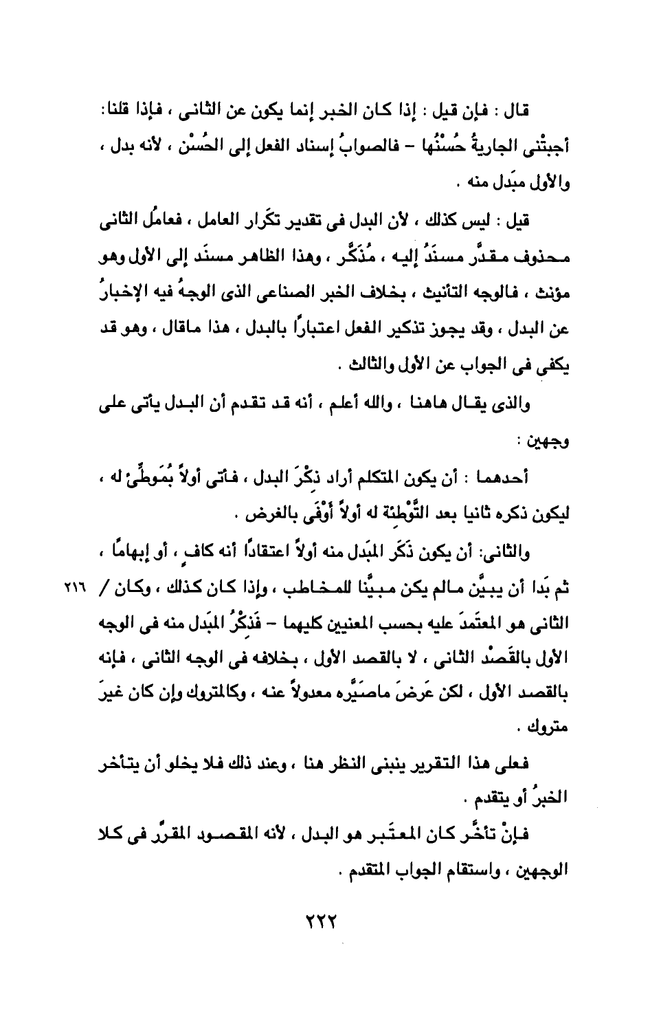 قال: فإن قيل: إذا كان الخبر إنما يكون عن الثاني، فإذا قلنا: أجبتني الجارية حسنها - فالصواب إسناد الفعل إلى الحسن، لأنه بدل، والأول مبدل منه.