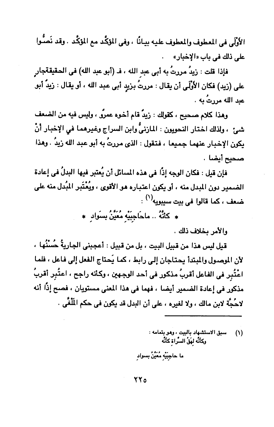 فإذا قلت: زيد مررت به أبى عبد الله، فـ (أبو عبد الله) في الحقيقة جارٍ على (زيد) فكان الأولى أن يقال: مررت بزيدٍ أبي عبد الله، أو يقال: زيد أبو عبد الله مررت به.