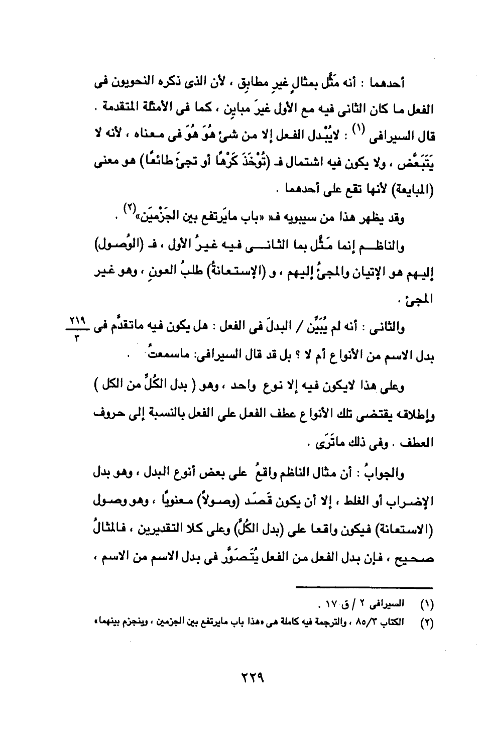 والجواب: أن مثال الناظم واقع على بعض أنواع البدل، وهو بدل الإضراب أو الغلط، إلا أن يكون قصد (وصولاً) معنويًا، وهو وصول (الاستعانة) فيكون واقعا على (بدل الكل) وعلى كلا التقديرين، فالمثال صحيح، فإن بدل الفعل من الفعل يتصور في بدل الاسم من الاسم،