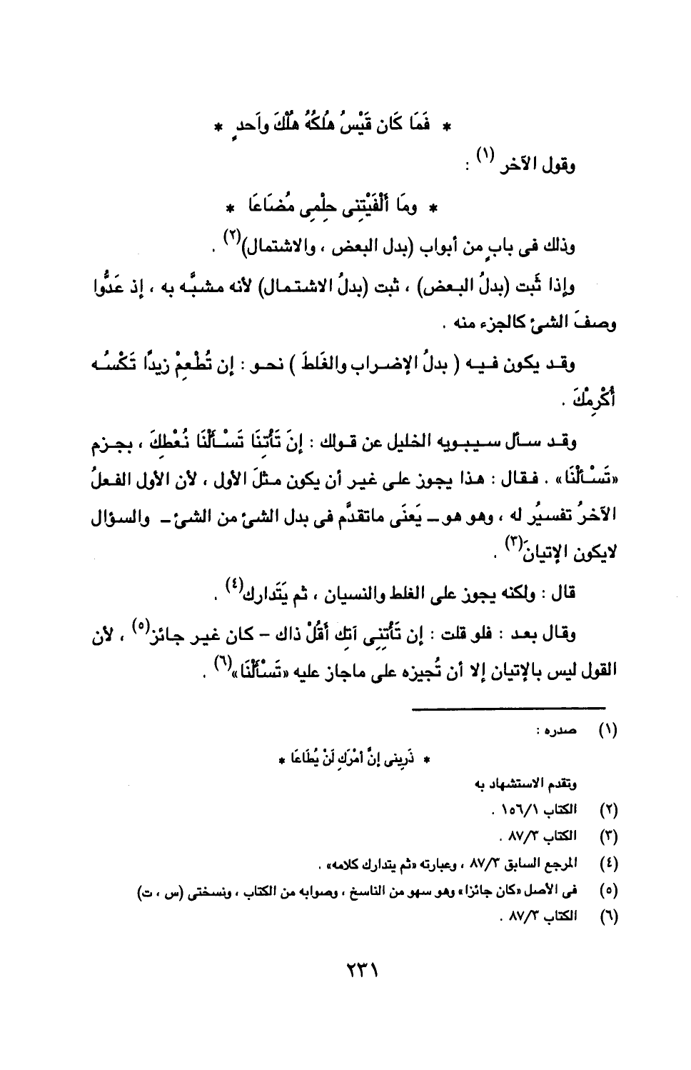 وقد سأل سيبويه الخليل عن قولك: إن تأتنا تسألنا نعطك، بجزم "تسألنا". فقال: هذا يجوز على غير أن يكون مثل الأول، لأن الأول الفعل الآخر تفسير له، وهو هو - يعني ما تقدم في بدل الشيء من الشيء - والسؤال لا يكون الإتيان.