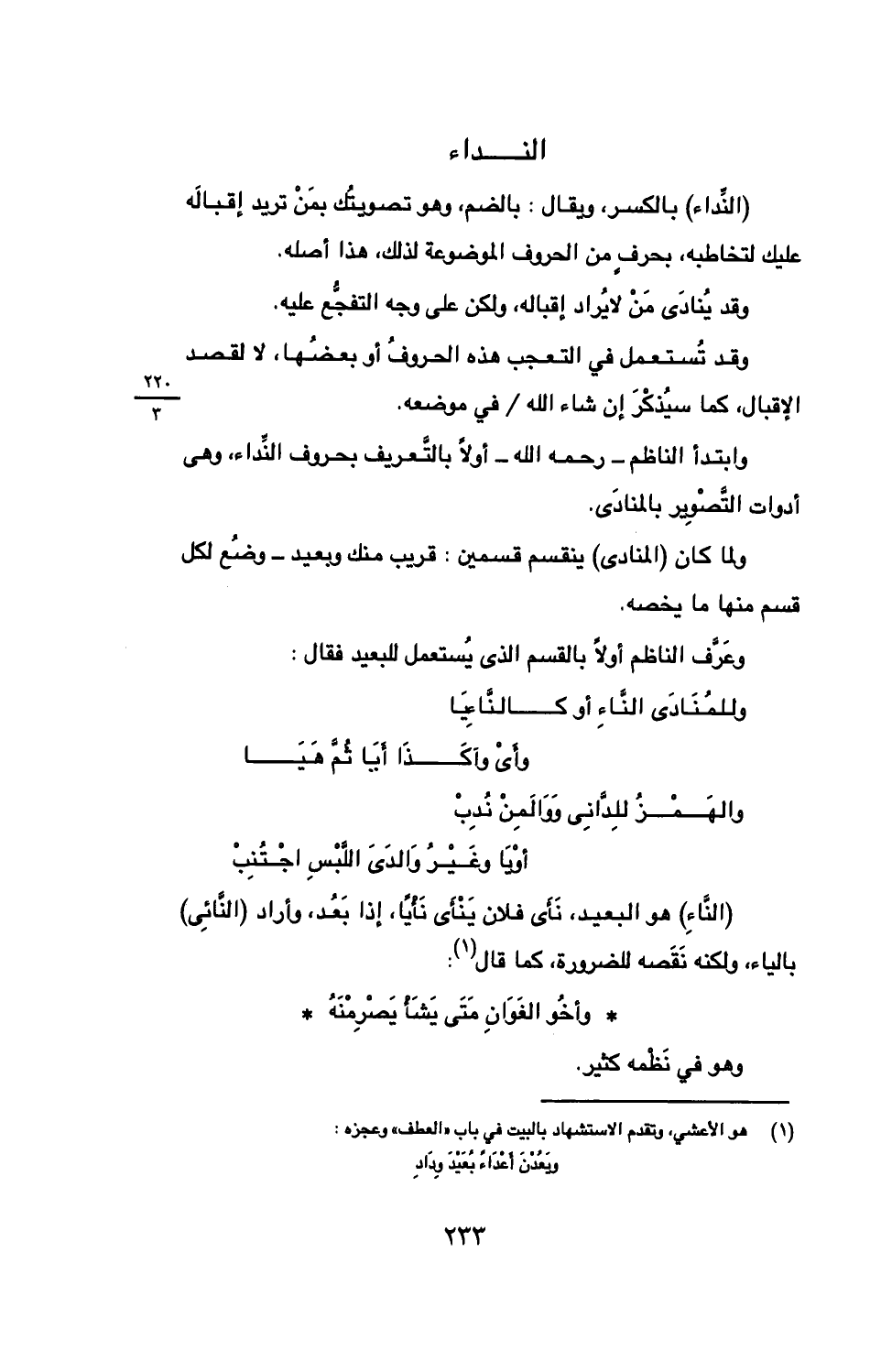 (النداء) بالكسر، ويقال: بالضم، وهو تصويتك بمن تريد إقباله عليك لتخاطبه، بحرفٍ من الحروف الموضوعة لذلك، هذا أصله.