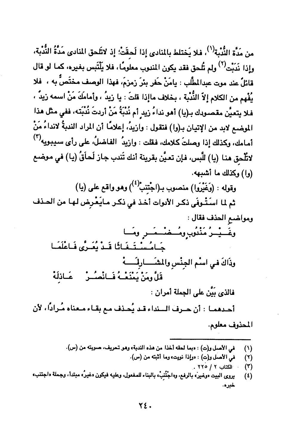من مدة الندبة، فلا يختلط بالمنادى إذا لحقت؛ إذ لا تلحق المنادى مدة الندبة، وإذا ندبت ولم تلحق فقد يكون المندوب معلومًا، فلا يلتبس بغيره، كما لو قال قائل عند موت عبد المطلب: يا من حفر بئر زمزم، فهذا الوصف مختص به، فلا يفهم من الكلام إلا الندبة، بخلاف ما إذا قلت: يا زيد، وأمامك من اسمه زيد، فلا يتعين مقصودك بـ (يا) أهو نداء زيدٍ أم ندبة من أردت ندبته، ففي مثل هذا الموضع لابد من الإتيان بـ (وا) فتقول: وازيد، إعلامًا أن المراد الندبة لا نداء من أمامك، وكذلك إذا وصلت كلامك، فقلت: وازيد الفاضل، على رأى سيبويه لا تلحق هنا (يا) للبس، فإن تعين بقرينة أنك تندب جاز لحاق (يا) في موضع (وا) وكذلك ما أشبهه.